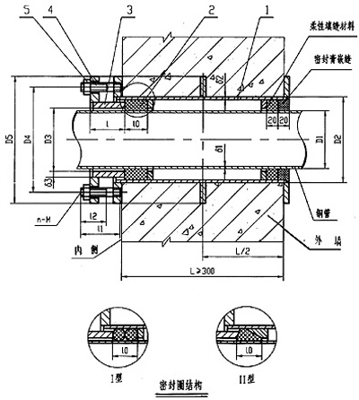 2、套管穿墻處如遇非混凝土墻壁時,應局部改用混凝土墻壁,其澆注范圍應比翼環(huán)直徑(D5)大200,而且必須將套管一次澆固于墻內。